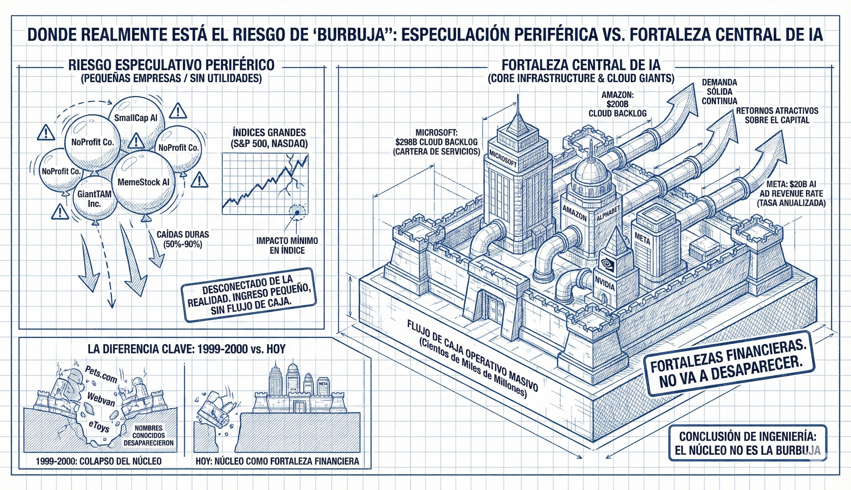La diferencia clave: en 1999-2000, las empresas en el corazón de la burbuja fueron las que colapsaron. Pets.com, Webvan, eToys—eran los nombres que todos conocían, y todos desaparecieron. Hoy, los nombres especulativos están en la periferia. El núcleo—Microsoft, Amazon, Alphabet, Meta, NVIDIA—son fortalezas financieras que generan cientos de miles de millones en flujo de caja operativo.