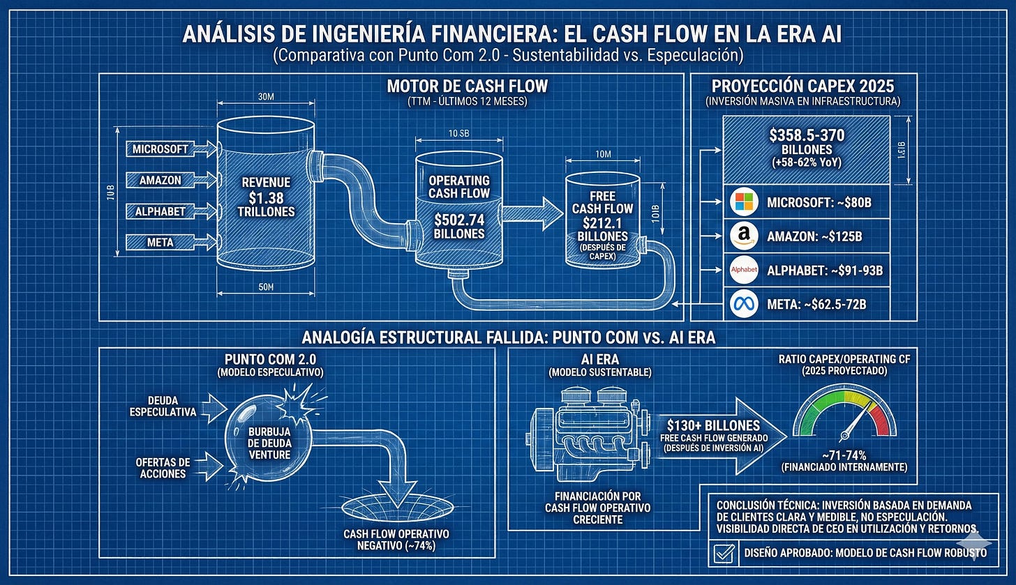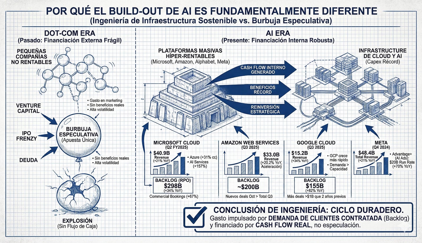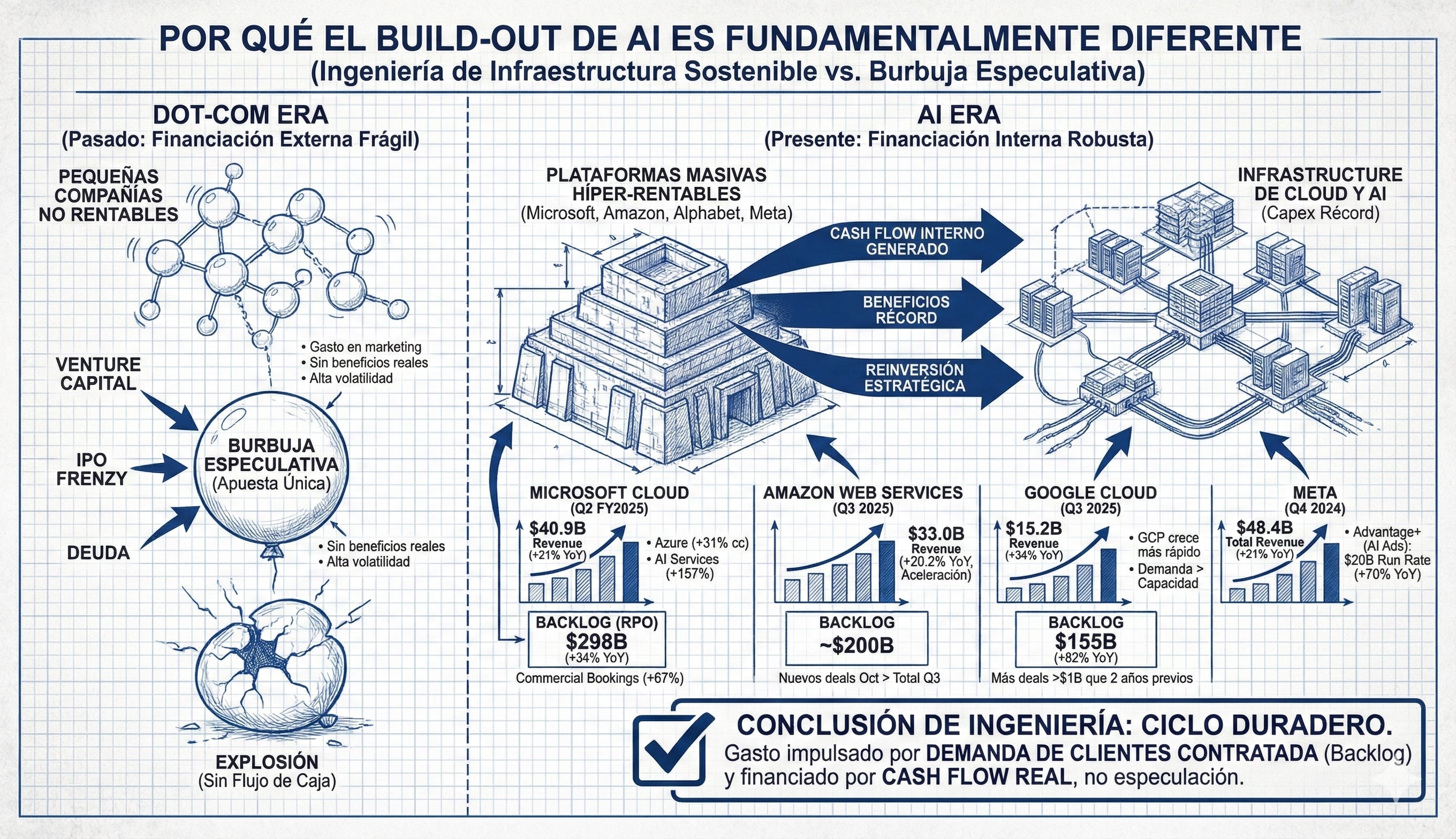 Los bears miran esos números de capex y ven una burbuja. Intentan mapear el gasto de hoy directamente al build-out temerario de telecomunicaciones e infraestructura de finales de los 90. El problema con esa analogía es que este gasto no está siendo financiado por deuda venture especulativa u ofertas de acciones en serie. Está siendo financiado por cash flow operativo creciente en cuatro de las compañías más rentables del mundo.