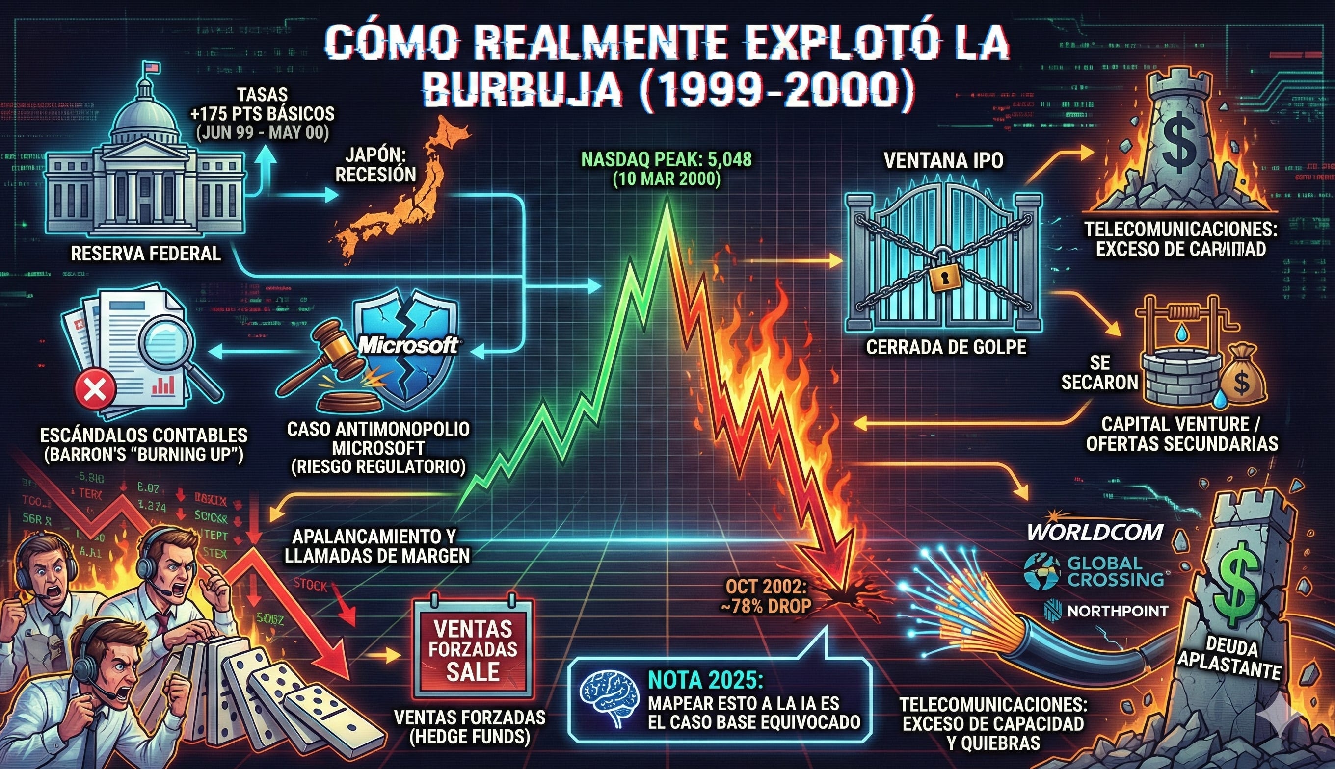 Para el año 2000, muchas compañías punto com tenían cash flow operativo profundamente negativo y ningún camino creíble hacia ganancias positivas. Su supervivencia dependía de un flujo interminable de capital fresco que incluía financiamiento venture antes de un IPO, ofertas secundarias y deuda convertible después del IPO. Eso hizo que todo el ecosistema fuera extremadamente sensible a cambios en el sentimiento y condiciones macro. Un modelo de negocio frágil más valoraciones extremas es exactamente la receta para una burbuja.