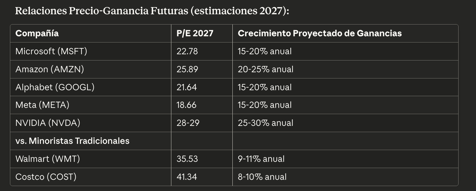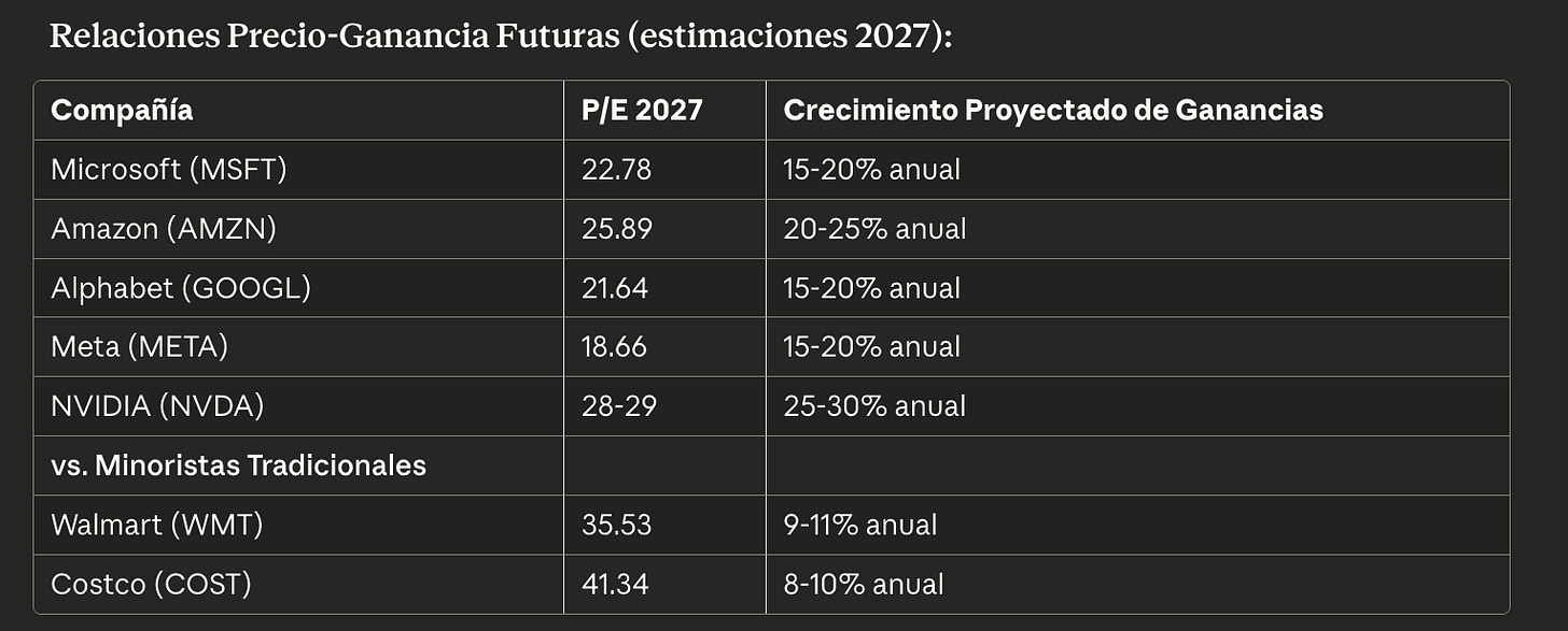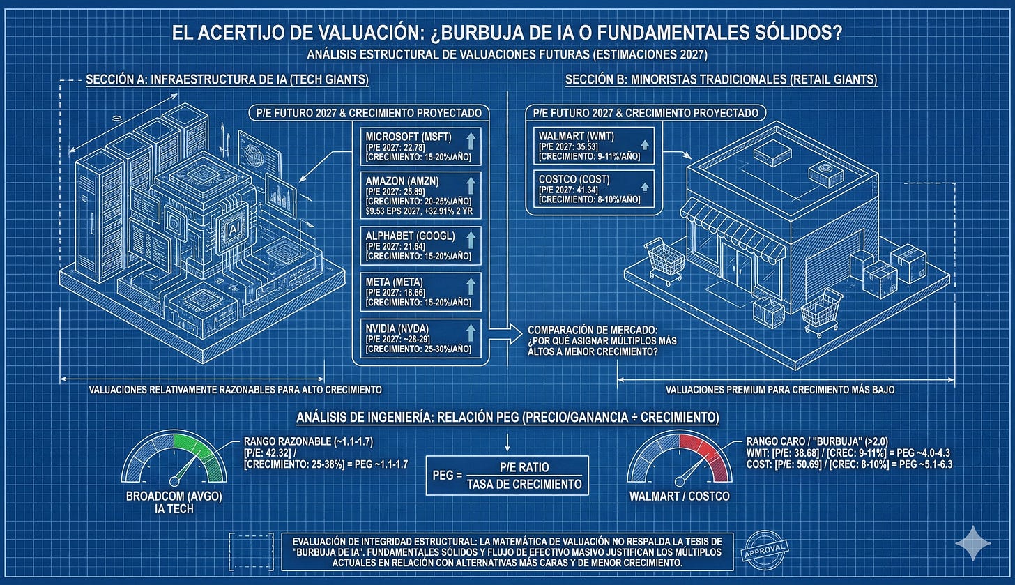 NVIDIA, frecuentemente citada como el ejemplo principal de exceso de valuación de AI, está cotizando a aproximadamente 28-29 veces ganancias futuras de 2027. Eso está muy por debajo de Walmart a 35.53 veces y Costco a 41.34 veces. Y NVIDIA está proyectado crecer ganancias 25-30% anualmente versus 8-11% para los minoristas.