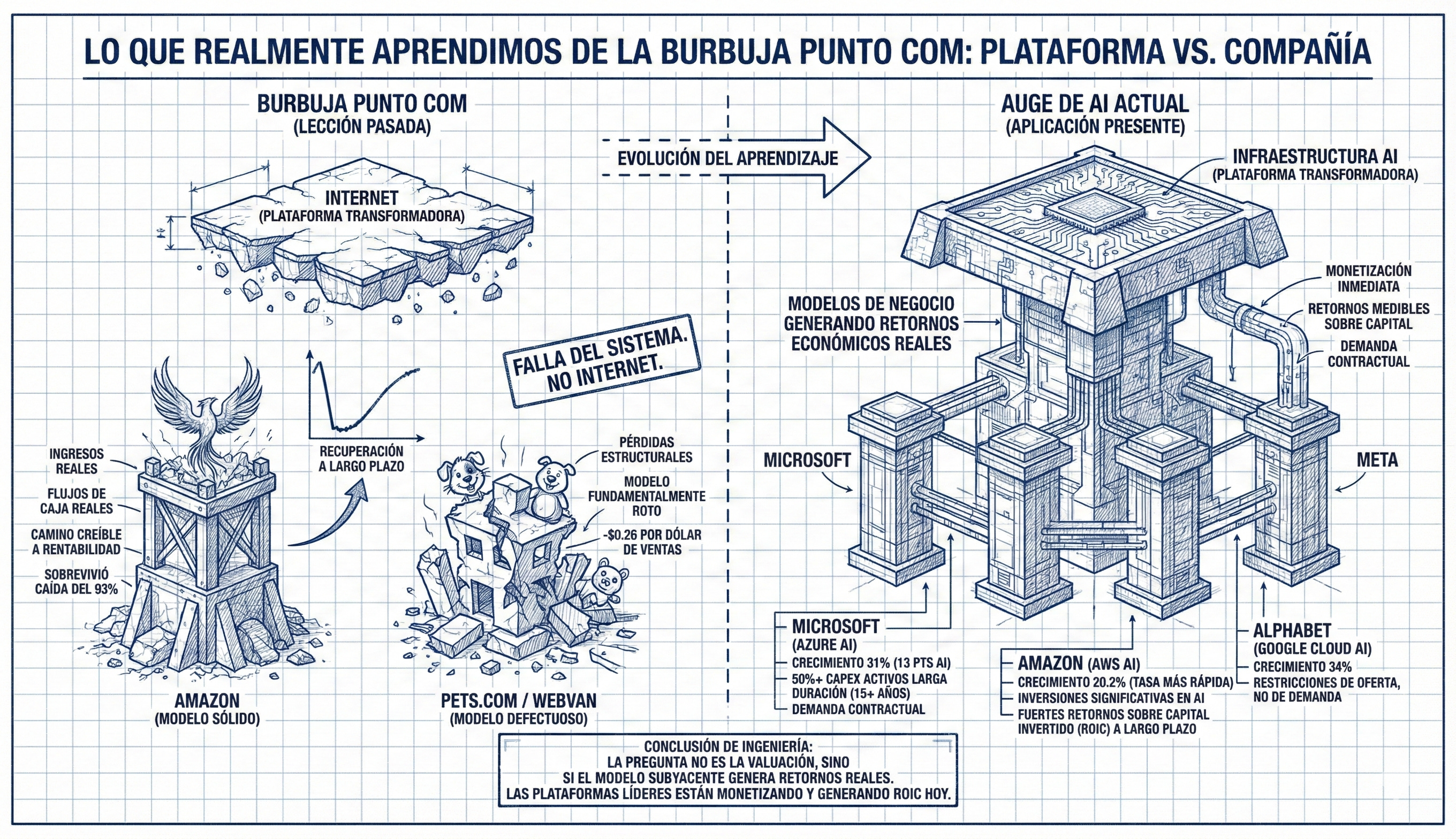 Eso no elimina los riesgos. El capex puede pasarse, la competencia puede intensificarse y los múltiplos pueden comprimirse. Elegir mal sigue teniendo consecuencias. Pero esperar un colapso estilo punto com en Microsoft, Amazon, Alphabet, Meta o NVIDIA es aplicar una analogía equivocada a un fenómeno que pertenece a otra categoría.