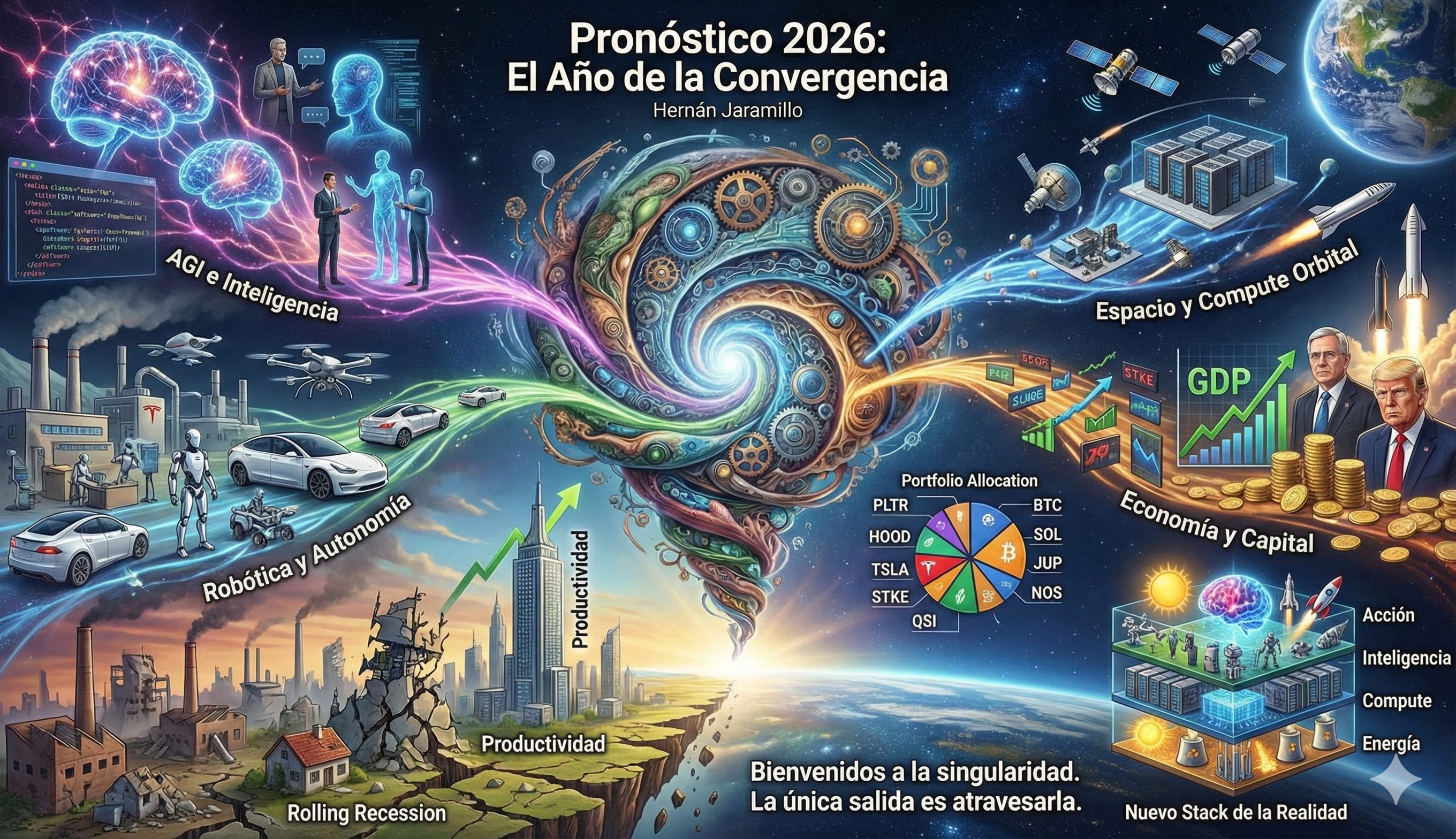 Todo eso ya pasó. La tesis tech sigue vigente, aunque con ajustes documentados en el artículo anterior sobre recalibración del algoritmo del 10x. Este pronóstico ha tomado más tiempo del usual, parcialmente por decisiones de tax loss harvesting en posiciones como STKE donde vendí algunos lotes con pérdidas mientras mantengo convicción en la tesis de largo plazo documentada en el deepdive de SOL Strategies. Pero principalmente la demora responde a que nunca había observado una convergencia tan evidente de cuatro fuerzas que, en su intersección, generan un nivel de complejidad que hace risibles los outlooks de UBS, Morgan Stanley o Jefferies con sus proyecciones lineales y rangos de confianza estrechos.