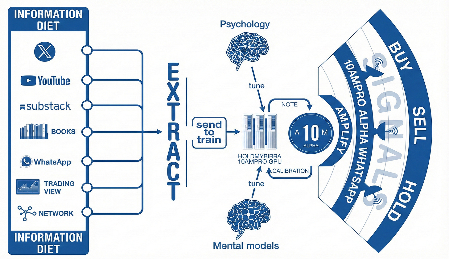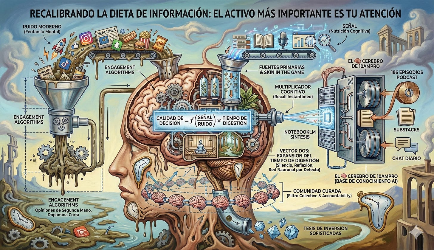 La dieta de información que se practica en 10AMPRO abarca un rango de seis a ocho horas diarias, incluyendo fines de semana, con algunas excepciones puntuales. Este nivel de dedicación puede parecer excesivo para quien no ha experimentado la diferencia entre consumir información de primera mano versus conformarse con resúmenes y opiniones de segunda generación. La analogía más precisa es la diferencia entre estudiar los estados financieros de una empresa versus leer el titular de un artículo que resume lo que un analista opinó sobre esos estados financieros.