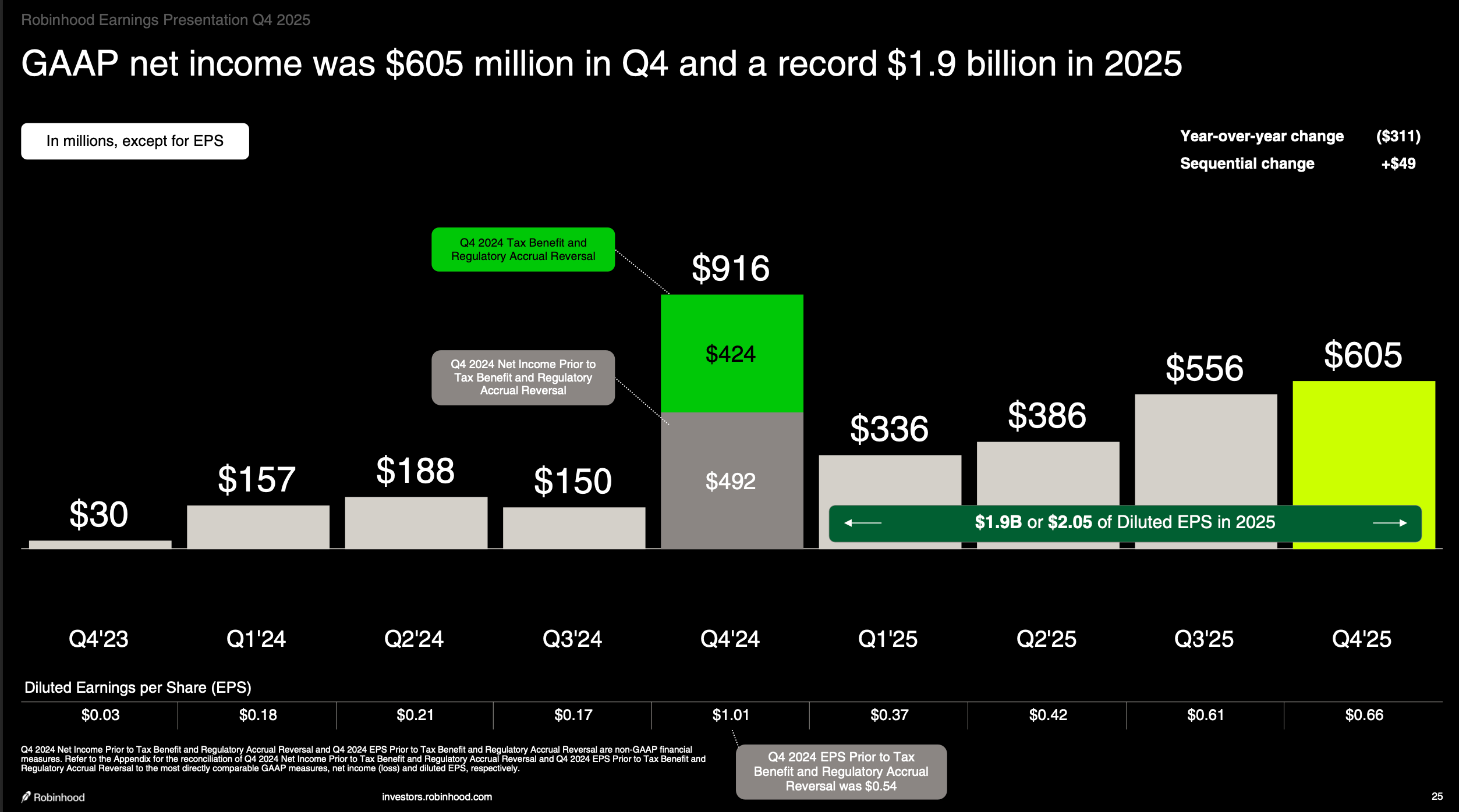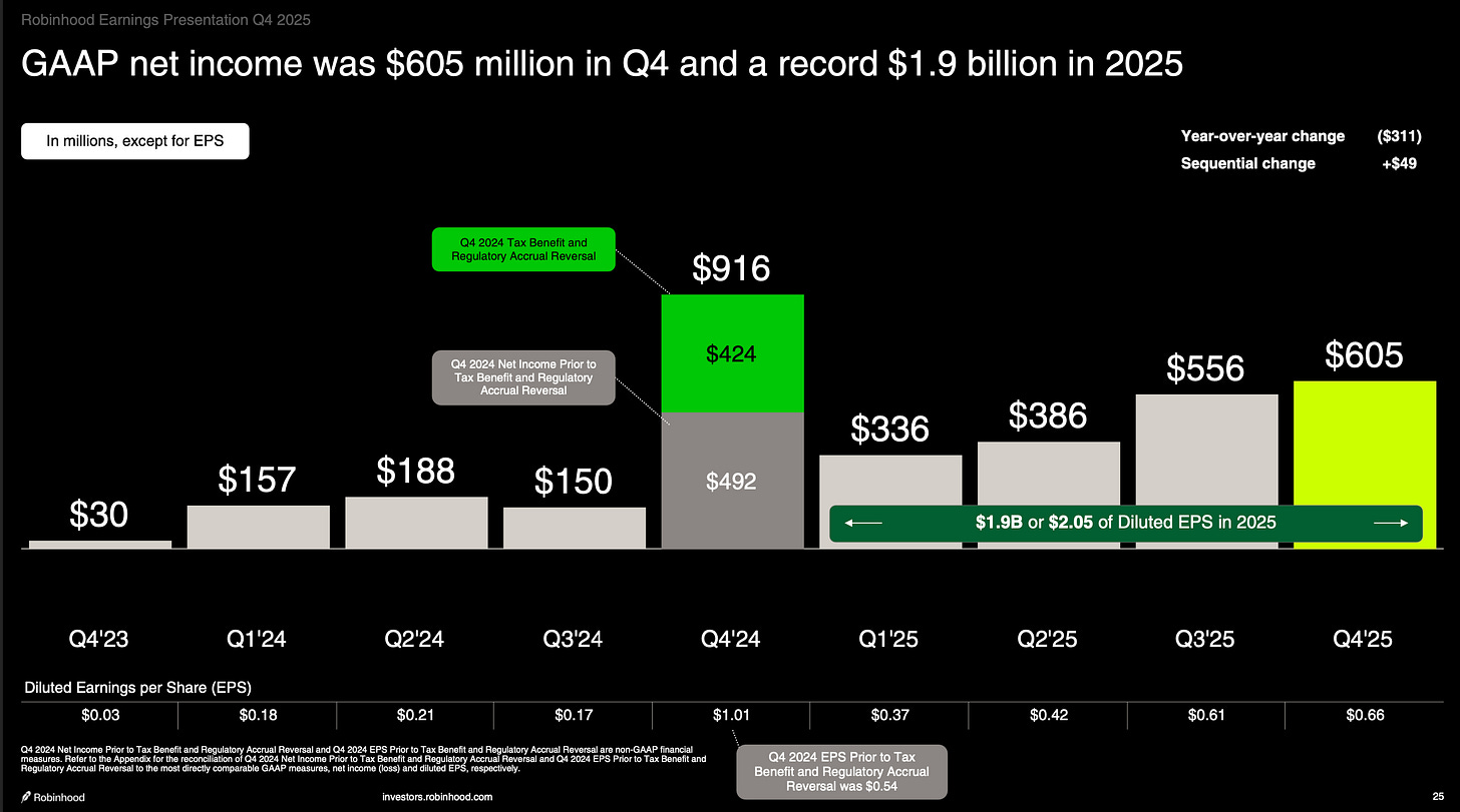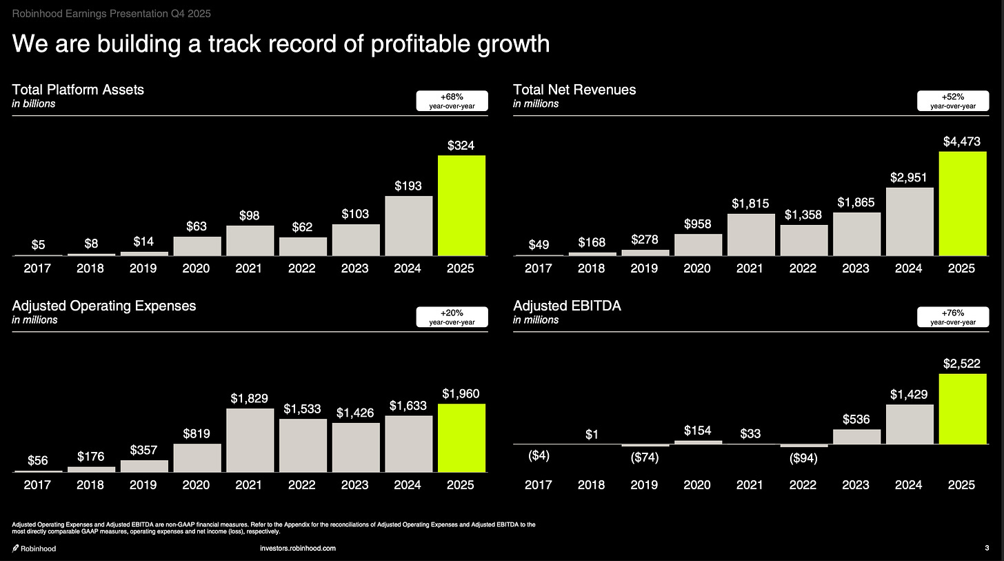 Seis meses después, Vlad Tenev y Shiv Verma — su nuevo CFO — entregaron los números del Q4. Los voy a poner uno detrás de otro porque el efecto acumulativo es el punto: $324B en activos totales de plataforma, crecimiento del 68% año contra año. Revenue de $4.5B en el año, crecimiento del 52%, el segundo año consecutivo por encima de 50%. Revenue se triplicó en tres años. GAAP Net Income de $1.9B — un salto del 33% contra 2024 con todo y que 2024 incluía un tax benefit de $424M en Q4 que infló artificialmente la base de comparación. Excluyendo ese one-time, el crecimiento real del net income fue del 91%. Adjusted EBITDA de $2.5B, crecimiento del 76%, con márgenes del 56%. EPS de $2.05, un crecimiento del 86% ajustando por el tax benefit del año anterior. Net deposits récord de $68B en el año, un growth rate del 35%, con ocho trimestres consecutivos superando los $10B.