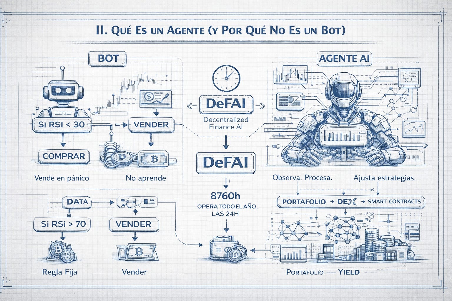 Primero hay que separar la señal del ruido. Un bot de trading es una instrucción estática: “si el RSI baja de 30, compra; si sube de 70, vende.” Un agente de AI es fundamentalmente diferente. Observa datos on-chain y off-chain en tiempo real. Procesa esa información con modelos de machine learning o LLMs. Razona sobre múltiples escenarios. Ejecuta transacciones multi-paso en smart contracts. Y aprende del resultado para ajustar su próxima decisión.