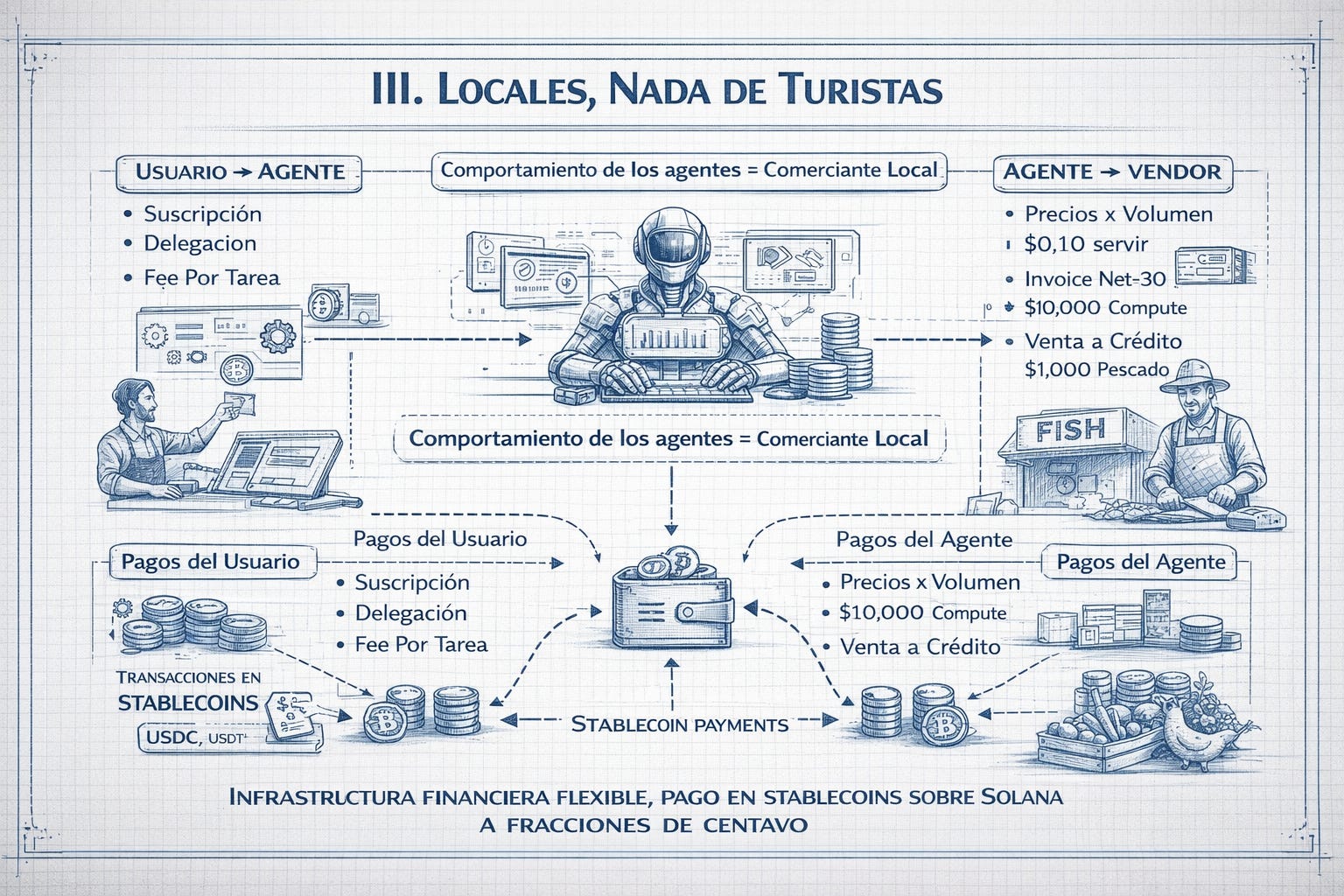 Sam Broner de a16z Crypto publicó una idea que me parece la mejor metáfora para entender cómo los agentes van a interactuar con la infraestructura financiera. Parafraseo: camina por un bazar como turista y ves un espectáculo de transacciones individuales — cada interacción su propia negociación, confianza mediada por efectivo, valor intercambiado con tarjeta. Pero así no funciona la mayoría del comercio en el bazar. Los locales se mueven con propósito hacia sus comerciantes favoritos. El dueño del restaurante va al carnicero, al pescadero, al agricultor. Pagan a crédito. Tienen relaciones pre-negociadas.